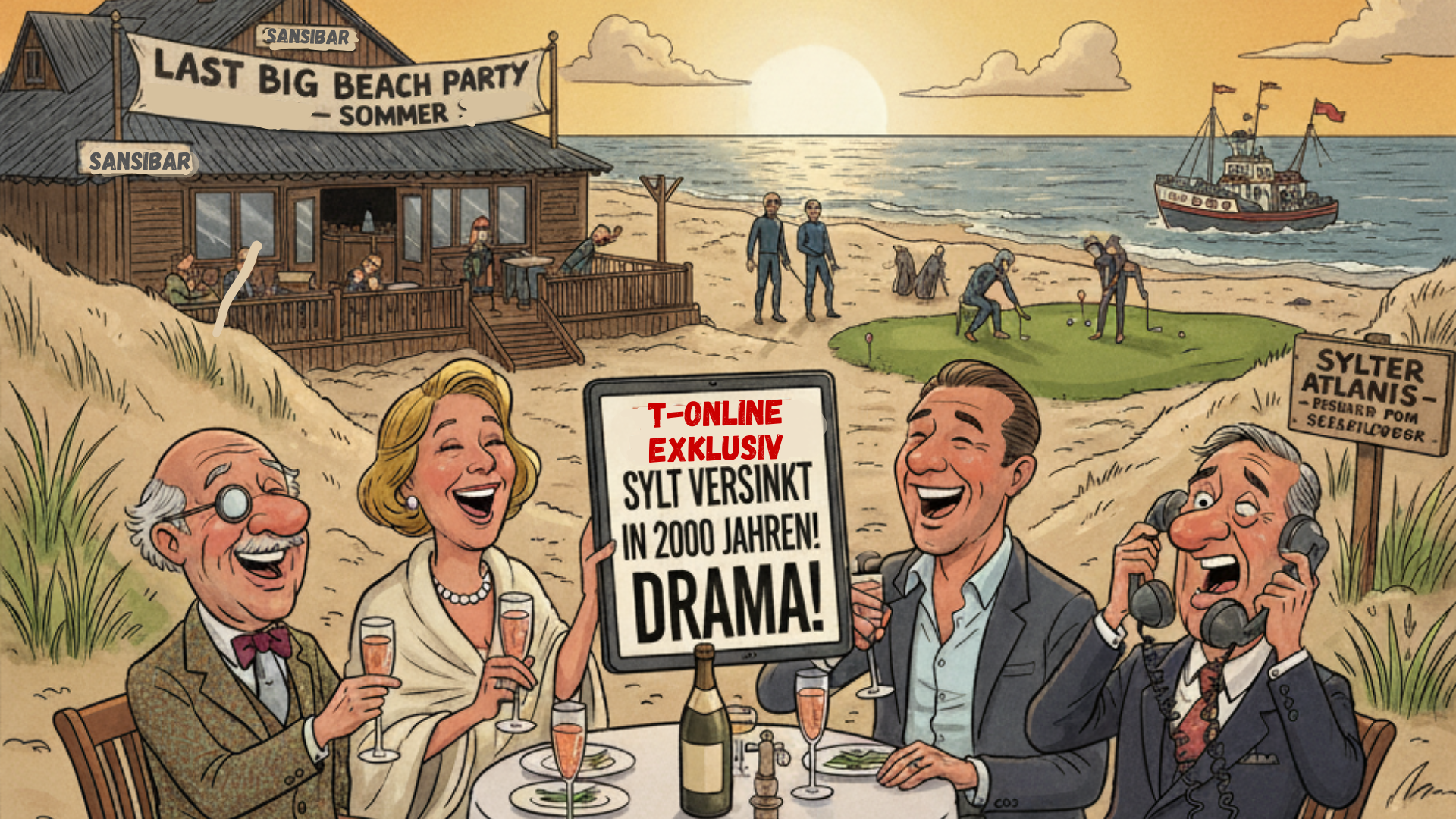 Der t-online-Bericht, der mit der dramatischen Zeile „Beliebte Nordsee-Insel Sylt versinkt im Meer“ aufmacht, wird unter Einheimischen bereits als „bestes Comedy-Skript des Jahres“ gehandelt. In der Whiskymeile in Kampen wurde der Artikel laut vorgelesen, was zu spontanen Heiterkeitsausbrüchen und einer Bestellung von extra trockenem Champagner führte.