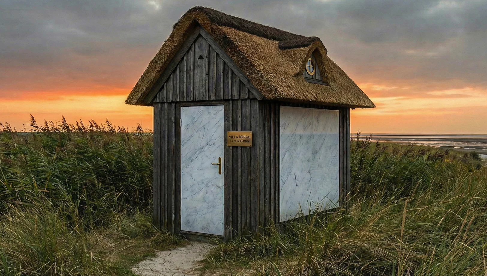 Das Objekt, vormals ein gut belüfteter Geräteschuppen aus den späten 80ern, wurde kernsaniert und nach den Prinzipien des „Radical High-End Micro-Living“ umgestaltet. Auf eine Küche wurde bewusst verzichtet. „Wer in Kampen kocht, hat die Kontrolle über sein Leben verloren“, so von Grafen-Reet. Stattdessen besticht der Innenraum durch einen multifunktionalen Monolithen aus Carrara-Marmor, der tagsüber als Champagner-Ablage und nachts – dank einer innovativen Falttechnik – als Schlafgelegenheit dient.